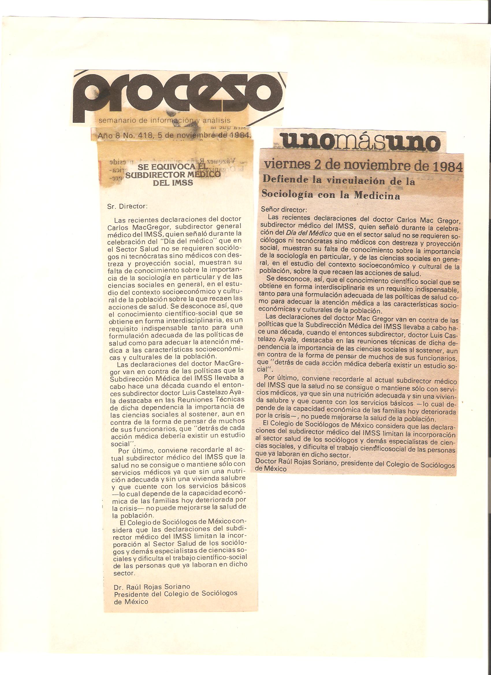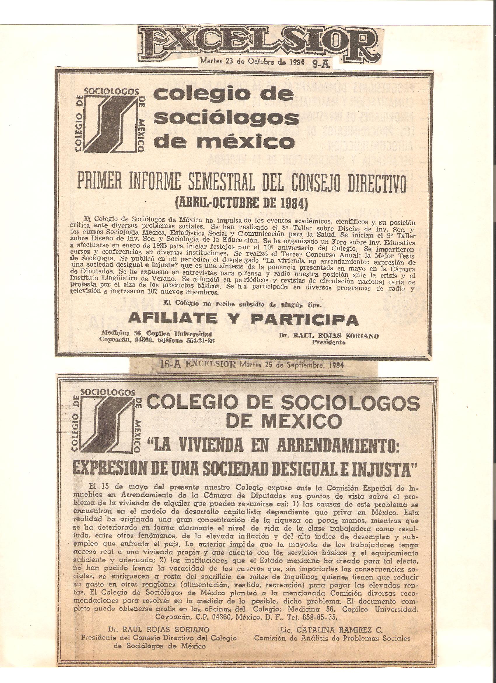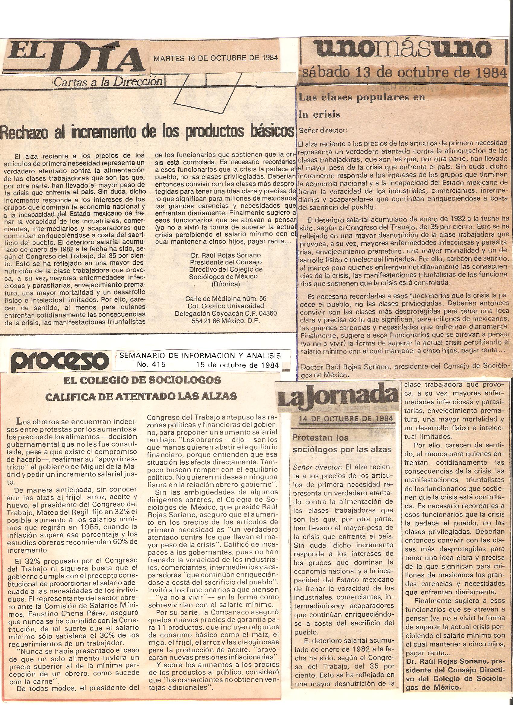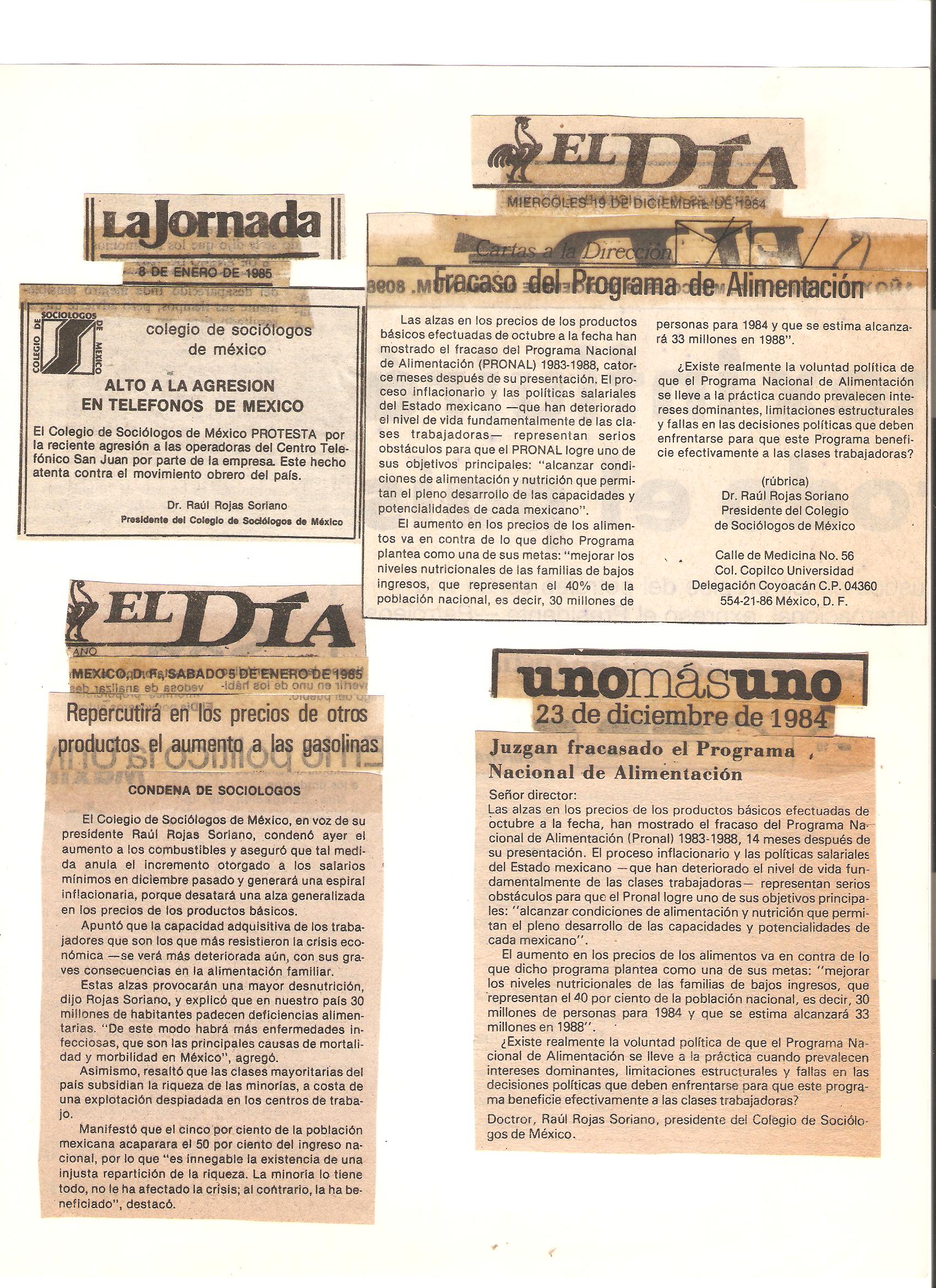 Algunos de los periódicos y revistas de México que entrevistaron al Dr. Raúl Rojas Soriano, o en los que se publicaron sus actividades profesionales, académicas y de transformación social cuando fue presidente del Colegio de Sociólogos de México, A.C. (abril de 1984 a abril de 1986)