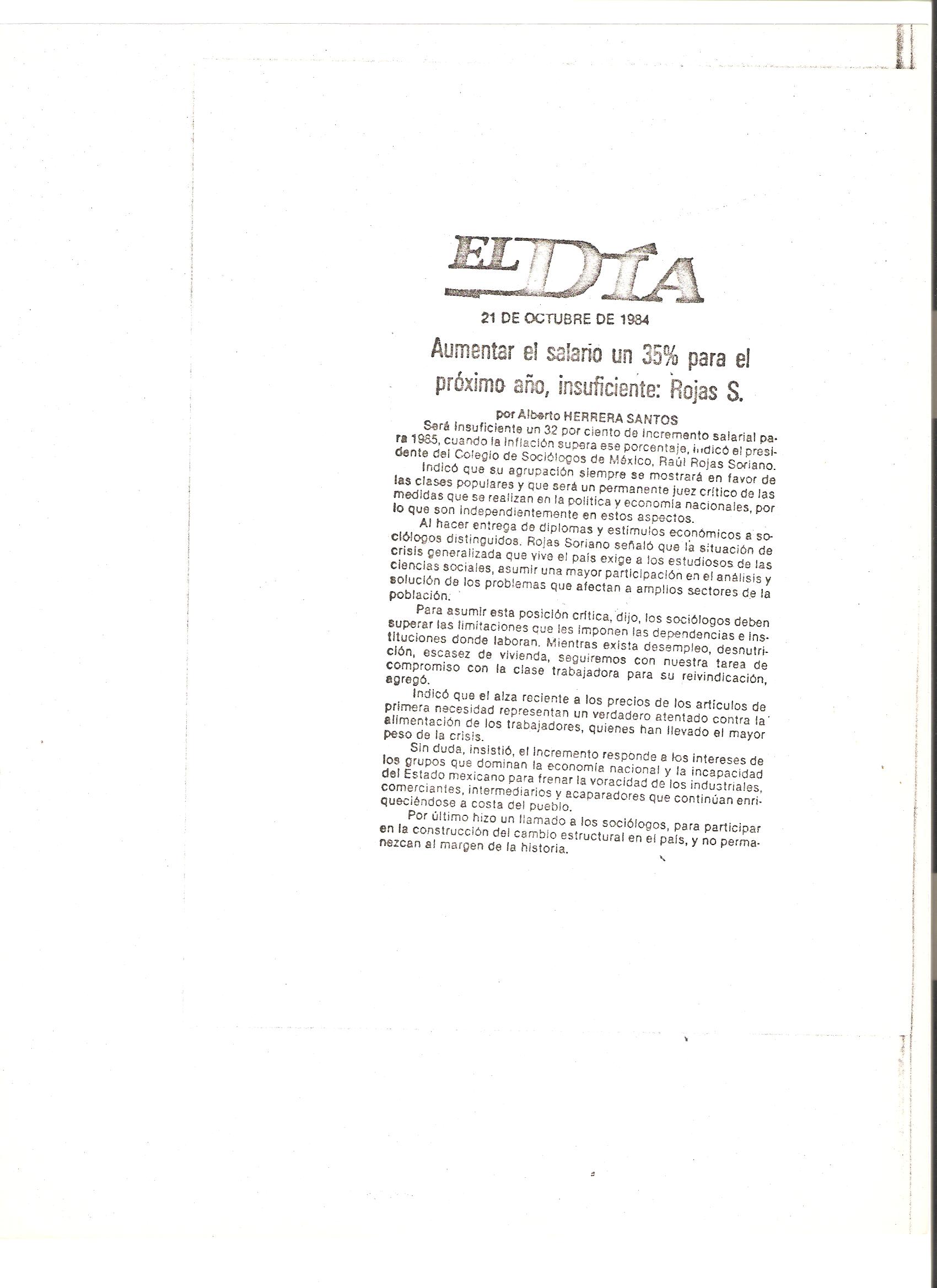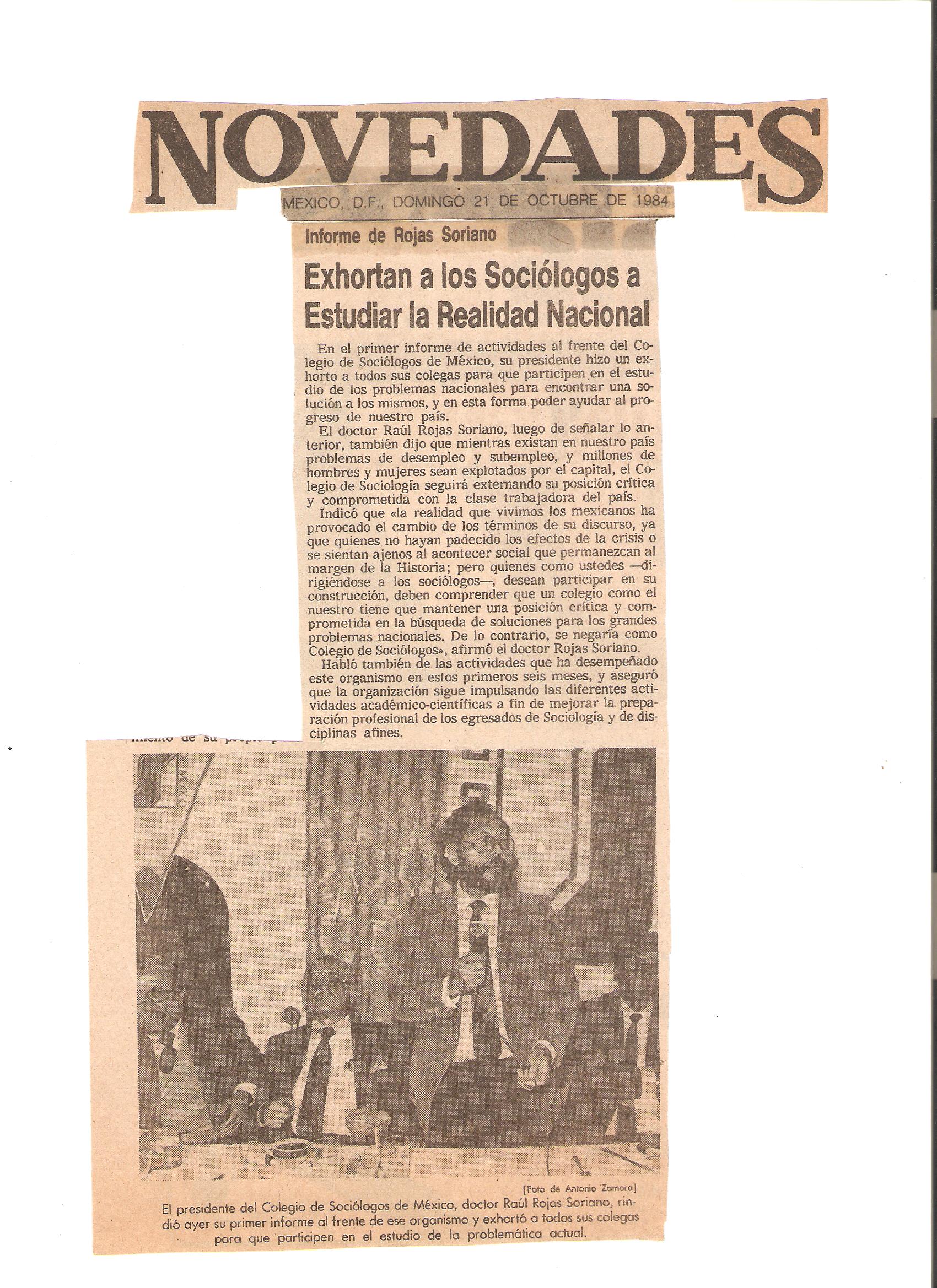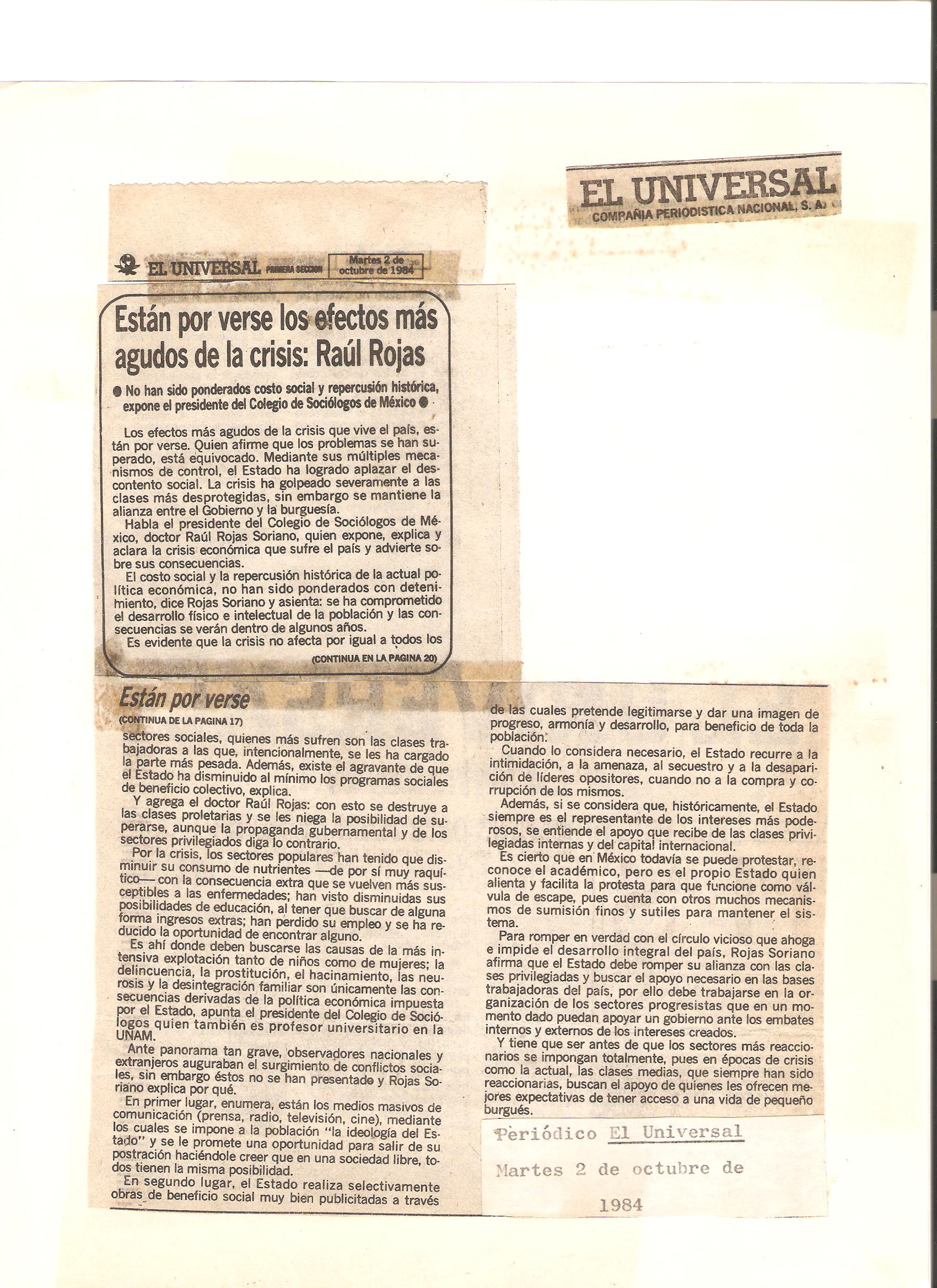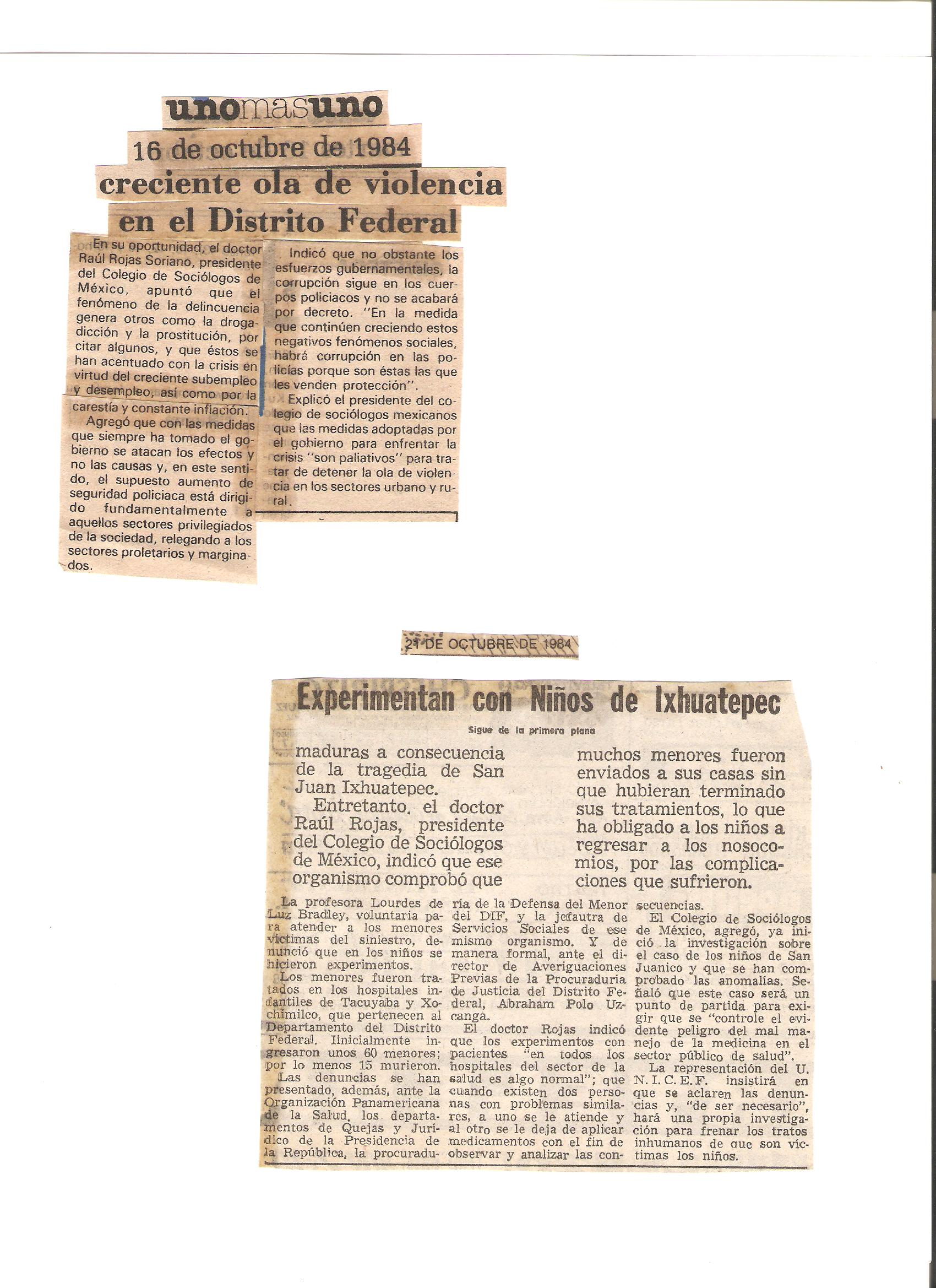 Algunos de los periódicos y revistas de México que entrevistaron al Dr. Raúl Rojas Soriano, o en los que se publicaron sus actividades profesionales, académicas y de transformación social cuando fue presidente del Colegio de Sociólogos de México, A.C. (abril de 1984 a abril de 1986)