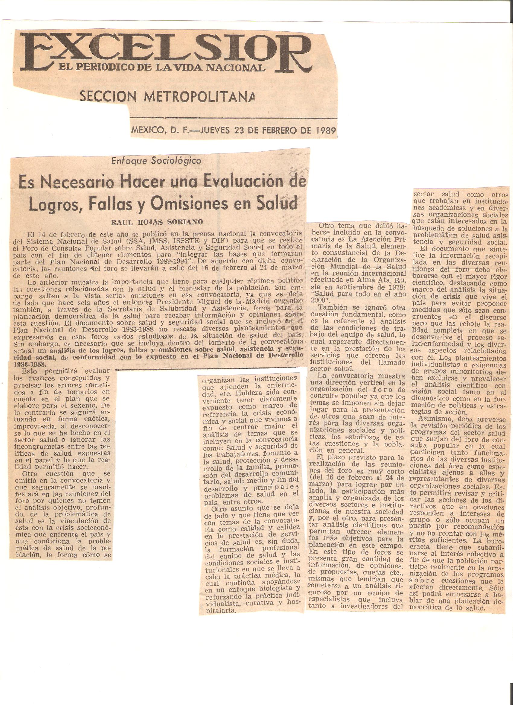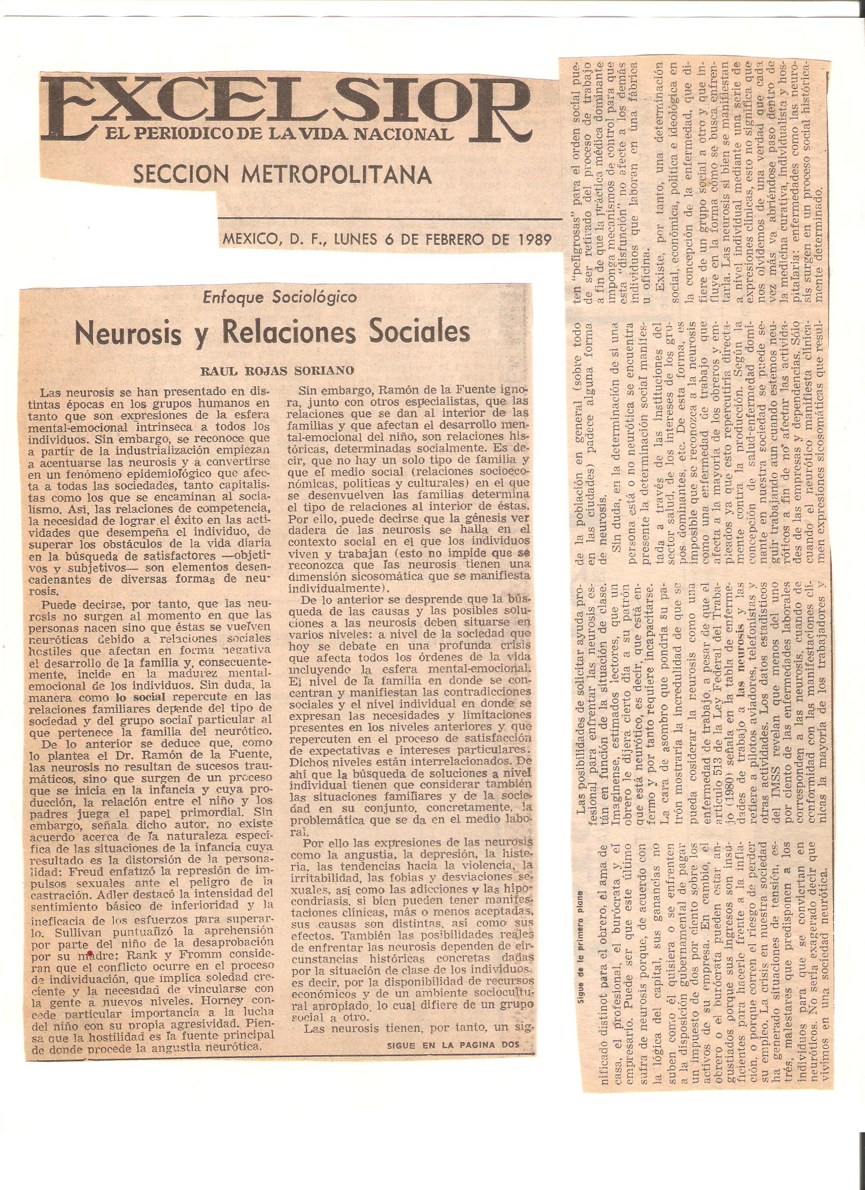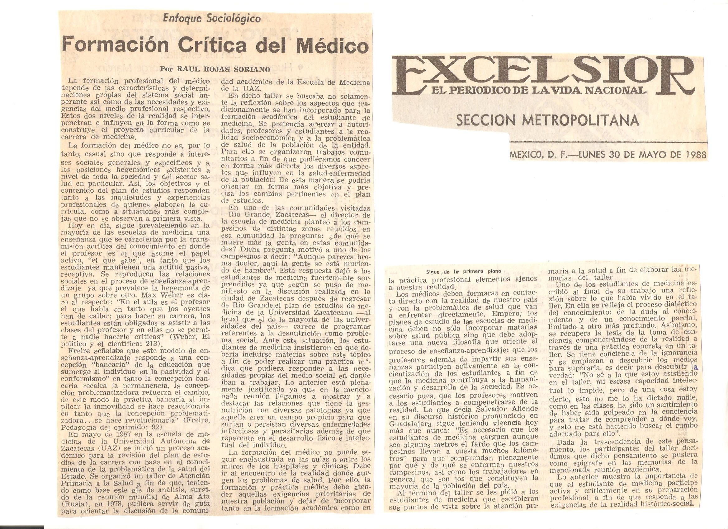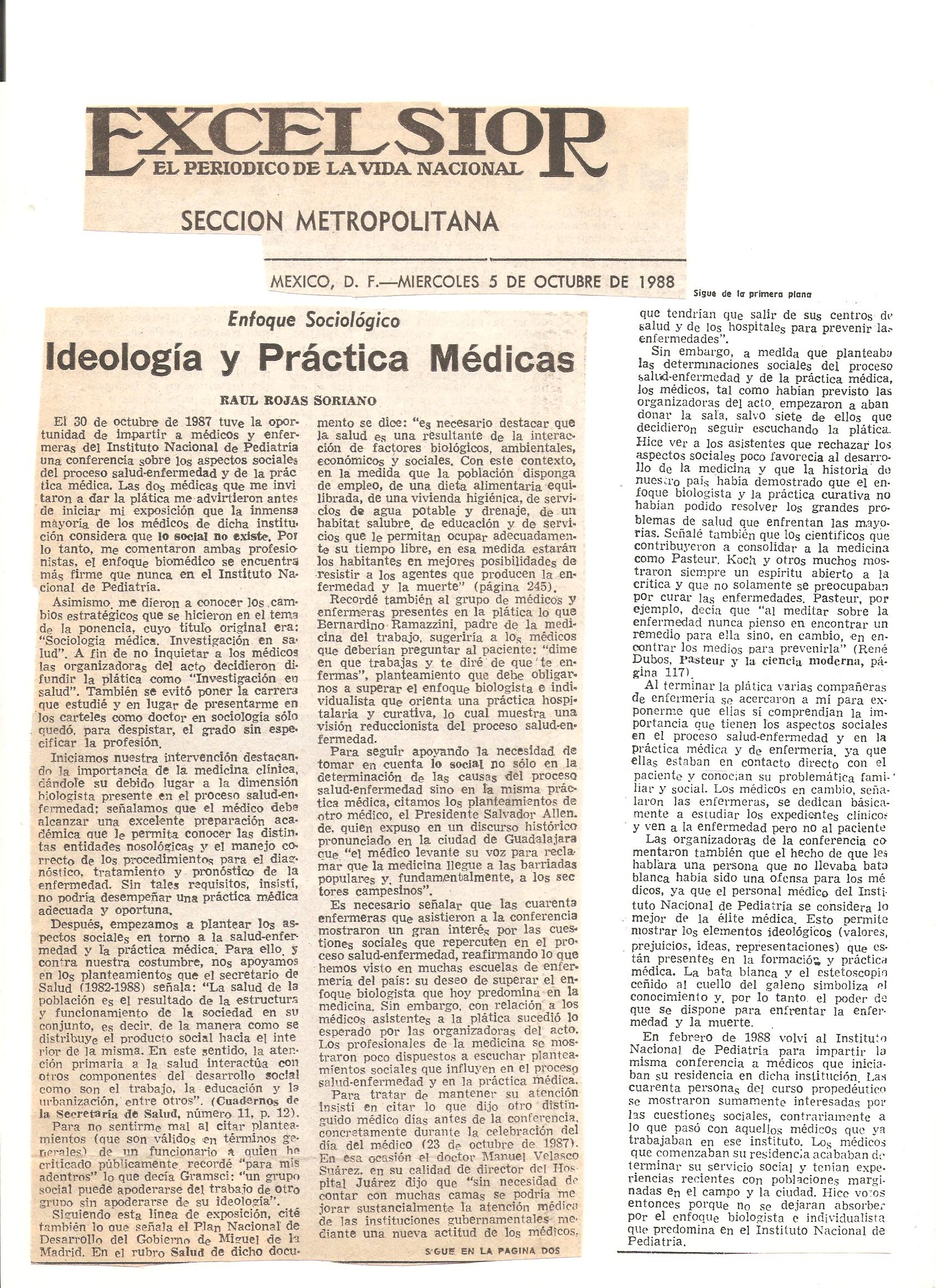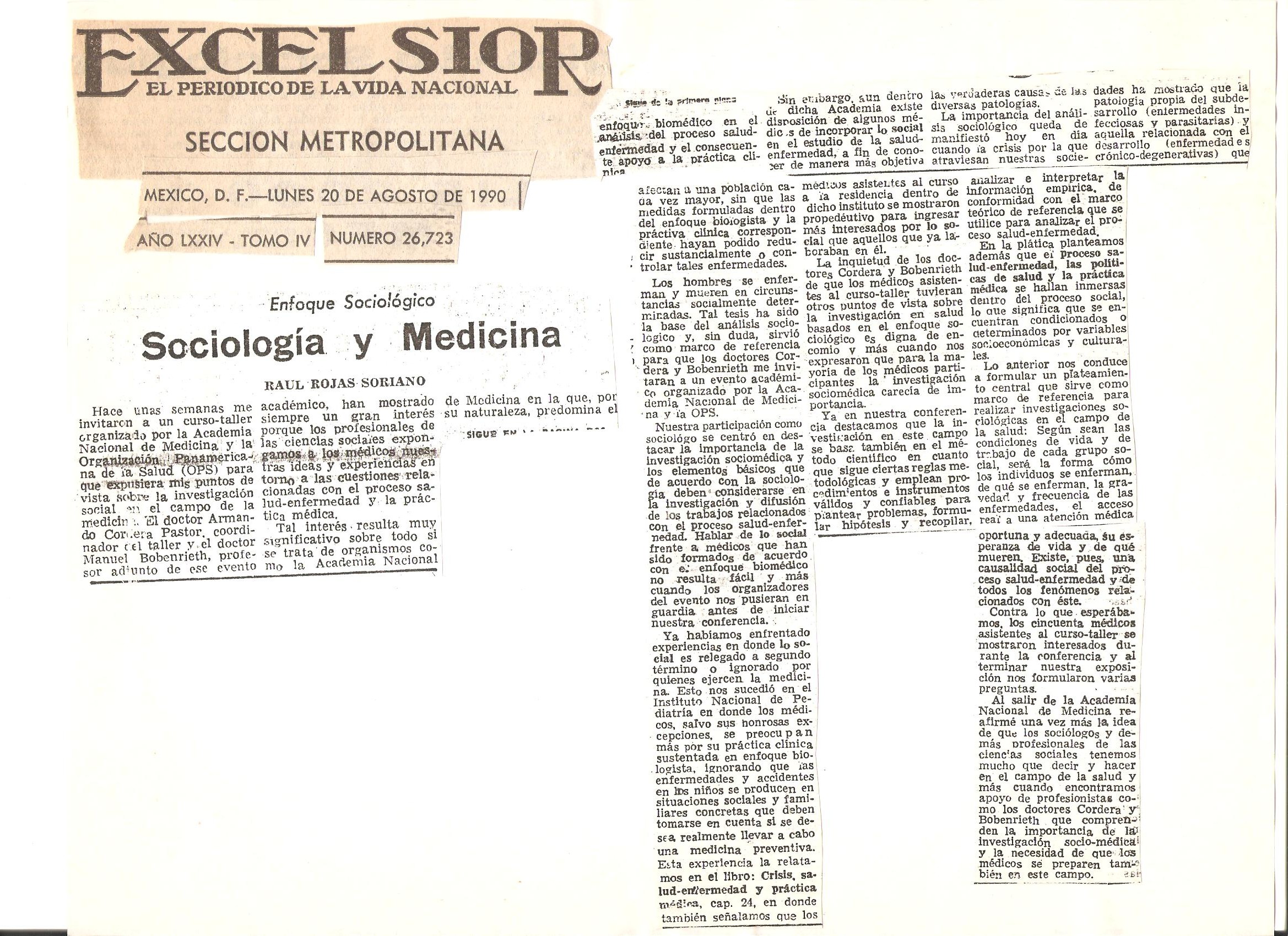 Sociología de la Salud-enfermedad y práctica médica en el periódico Excélsior. Sección: “Enfoque sociológico”. Artículos del Dr. Raúl Rojas Soriano (México, D.F.)
