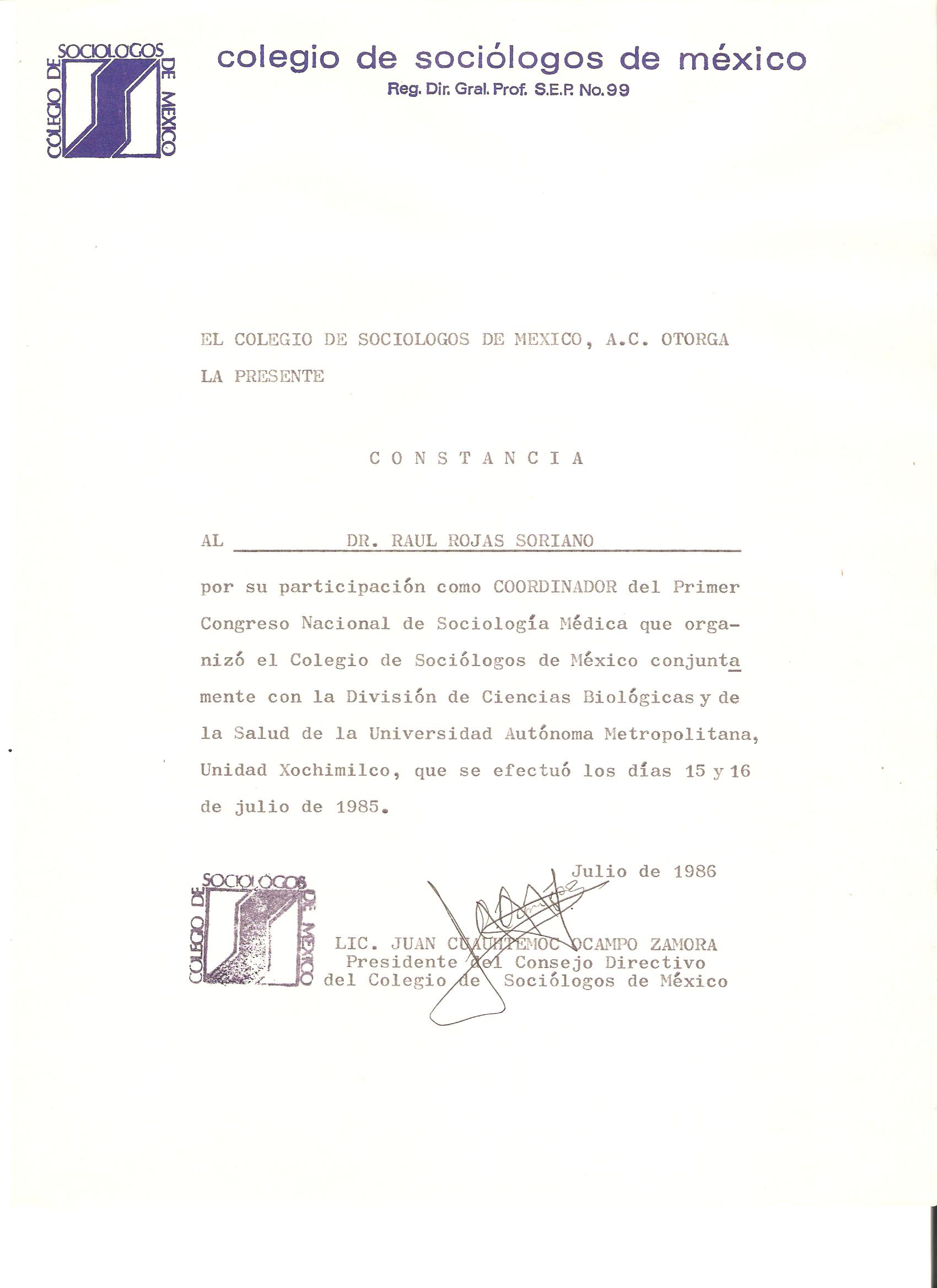 Gestión como presidente del Colegio de Sociólogos de México A.C. (1984-1986)